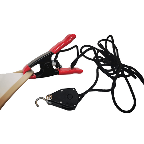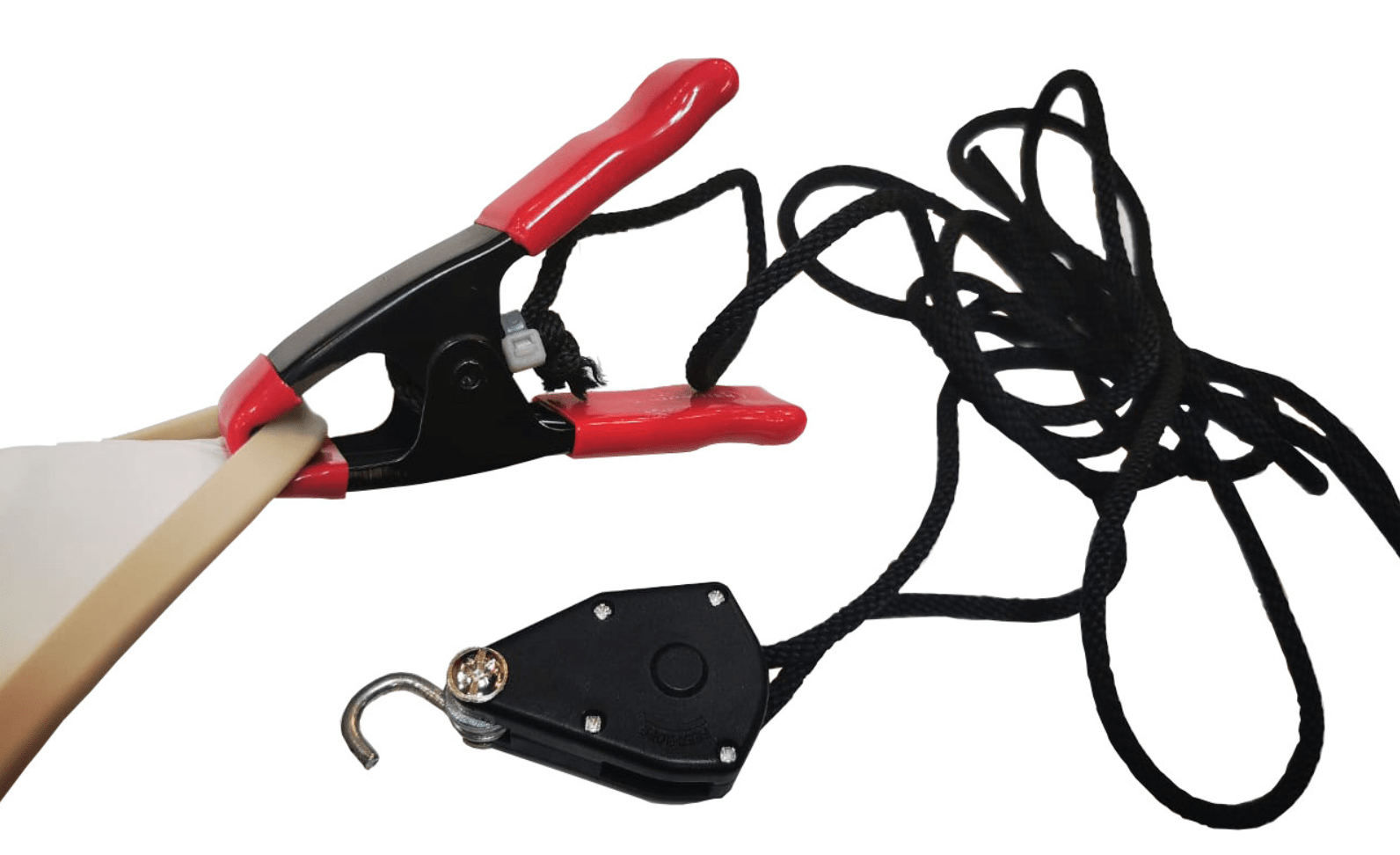 Третья рука (прищепка, краб, зажим, крокодил, держатель) предназначена для подвешивания натяжного полотна по углам комнаты. Это необходимо для удобного фиксирования полотна при монтаже натяжного потолка (прогреве и встегиванию полотна).