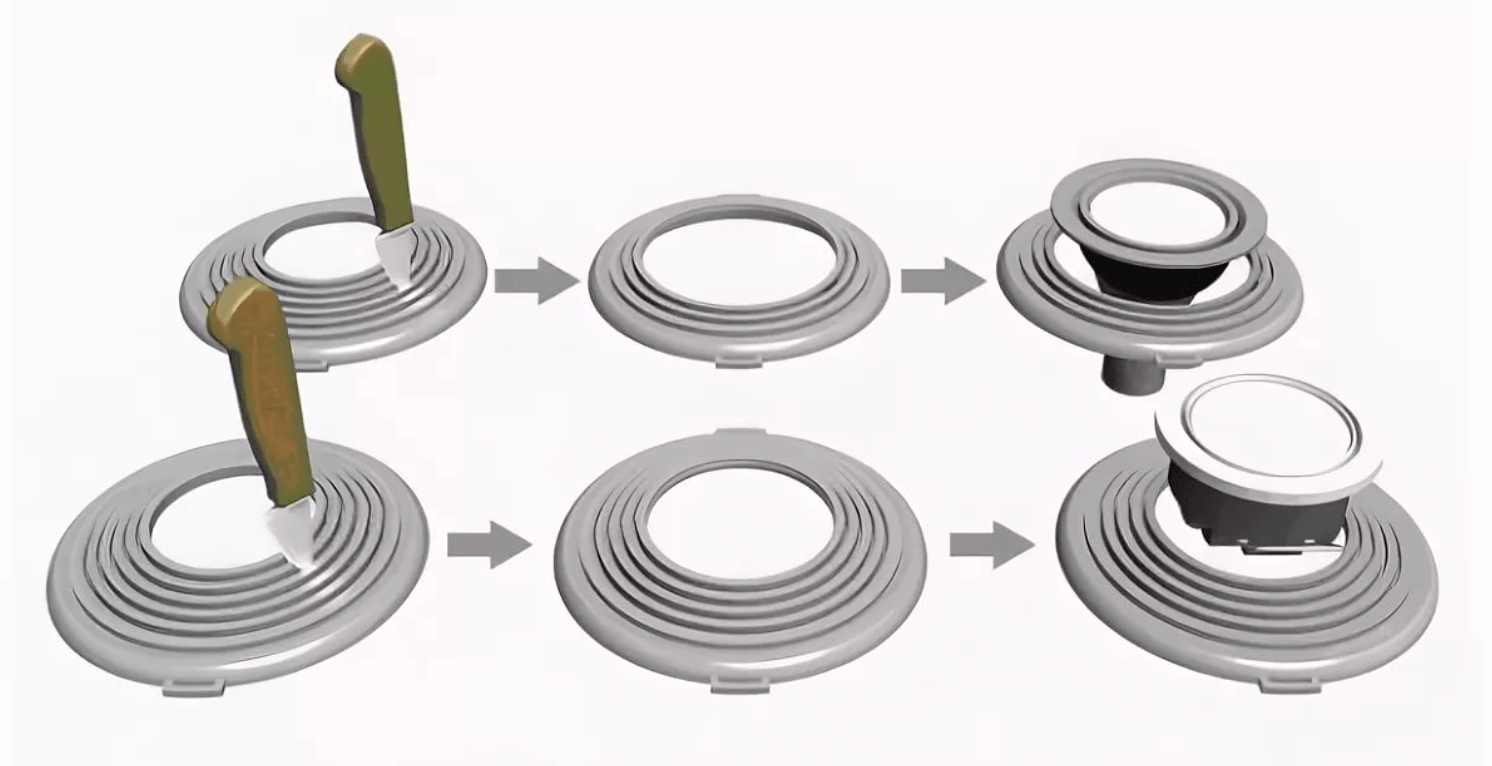 Платформа предназначена для монтажа точечных светильников различных диаметров. Благодаря универсальности конструкции, в данную платформу можно установить светильники с посадочным размером от 235 до 305 мм. Шаг изменения диаметра 10 мм. При подготовке платформы к установке необходимо выбрать нужный диаметр отверстия и с помощью ножа вырезать его по специальной канавке . Для удобства крепления перфоленты ( подвесов ) на платформе имеются специальные площадки с несквозными отверстиями. Наличие ребер жесткости и специального места для крепления перфоленты обеспечивает надежность конструкции и простоту при установке.