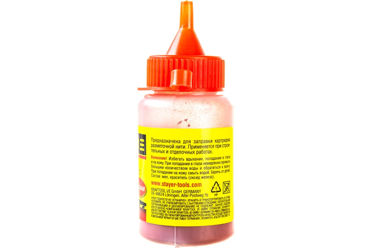 Меловой порошок STAYER (50 г) красный удобен в работе, за счет удлиненного носика аккуратно засыпается внутрь корпуса.