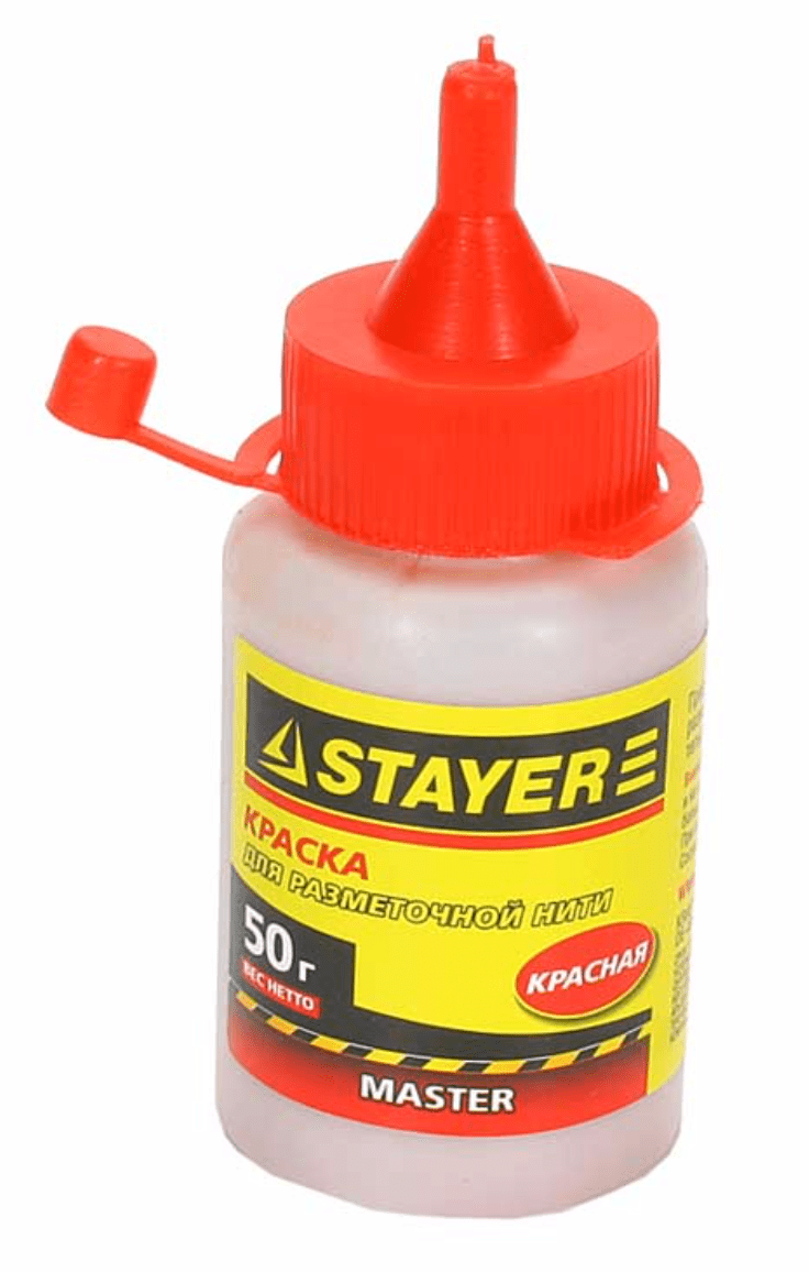 Широкое применение в ремонтных, отделочных, строительных работах находит разметочный шнур. С его помощью очень просто и легко «отбить» идеально ровную горизонтальную, диагональную, вертикальную линию. Достаточно натянуть шнур между двумя ранее поставленными отметками, слегка отвести и отпустить. В месте его соприкосновения с поверхностью останется ярко выраженный след (линия). Однако при условии интенсивного применения, красящая способность инструмента постепенно утрачивается. Получаемая разметка теряет былую четкость, становится блеклой и слабозаметной. В этом случае необходимо заправить разметочную нить, используя меловой порошок (50 г) красный STAYER .Он представляет собой специальный красящий состав, изготовленный на меловой основе.
