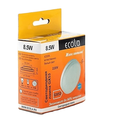 Светодиодные лампы с цоколем GX53 создают комфортный равномерный свет за счет большой площади и матовой поверхности колбы. Лампы GX53 используются совместно с точечным светильником для подвесных и натяжных потолков. Небольшие габаритные размеры и мощный световой поток являются главным преимуществом этих ламп. Световая эффективность 90Лм/Вт.