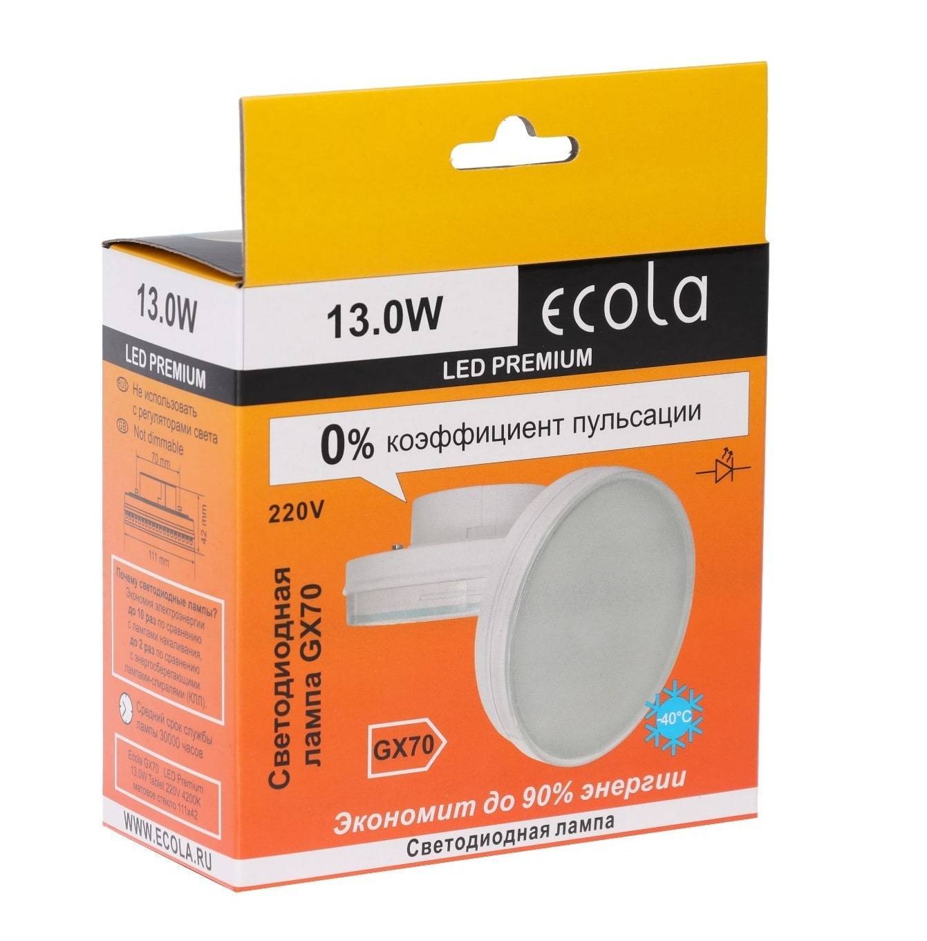 Светодиодная лампа Ecola с цоколем GX53 имеет мощность 13 Вт (аналог мощности лампы накаливания 130 Вт). Размеры составляют 42 мм по высоте и 111 мм по ширине.