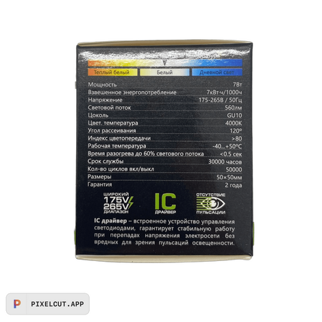 Новая модель рефлектора Экола GU10 с потребляемой мощностью 7 ватт заменяет галогенку мощностью в 60-65 ватт. Главными отличиями стало то, что лампа стала существенно меньше весить, что важно для натяжных потолков, а также за счет отсутствия алюминиевого радиатора стала ниже цена.