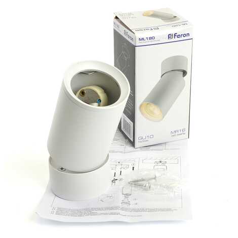 Цилиндрический накладной светильник ML180 Feron имеет надежный алюминиевый корпус, патрон GU10 для ламп MR16 и возможность направлять свет при изменении угла наклона светильника.