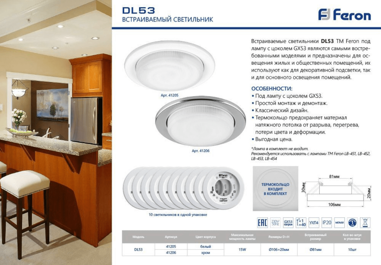 Светильник DL53 Feron типа GX53 предназначена для использования со встраиваемыми светильниками GX53, которые устанавливаются в натяжных потолках и подвесных системах. Применяется для освещения как в жилых, так и офисных помещениях, торговых залах, вестибюлях, фойе и т.д.