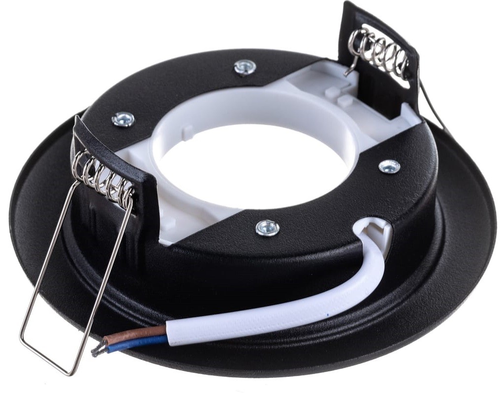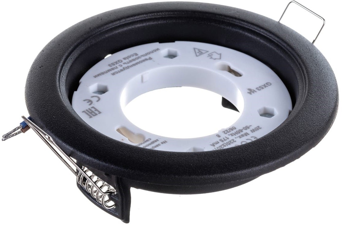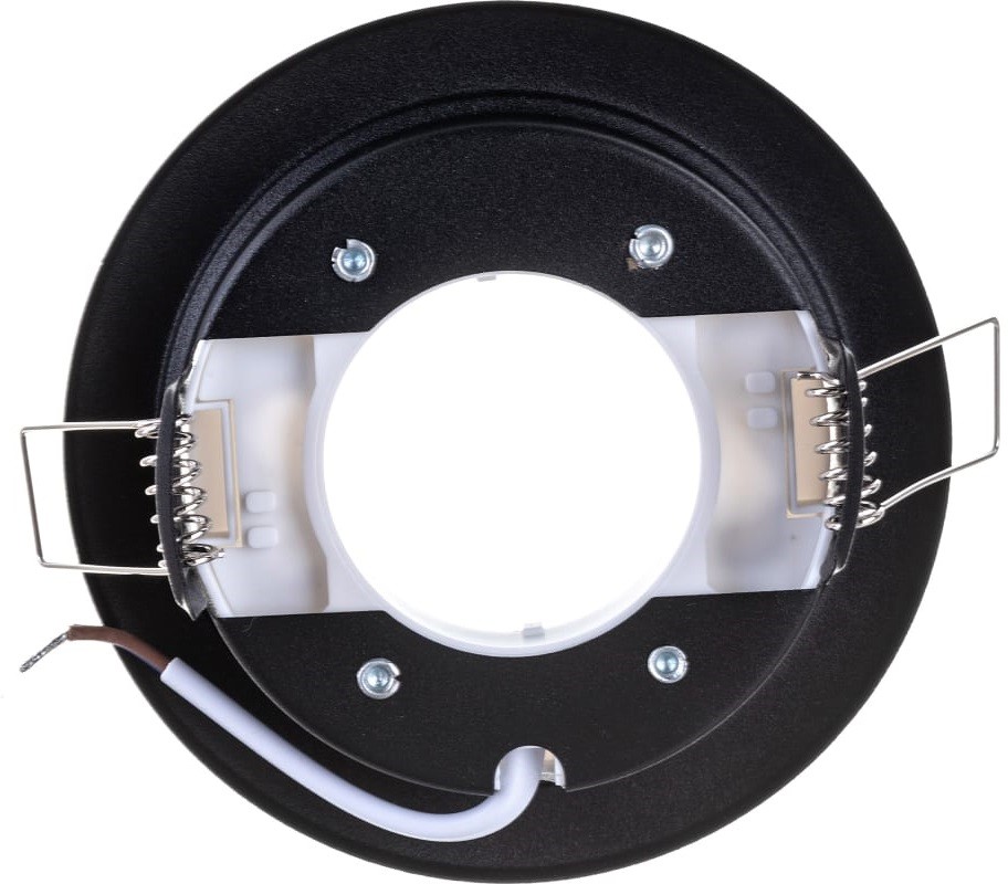Встраиваемый потолочный светильник Ecola GX53 H4 без рефлектора. Черный матовый. Размер 38x106. Размер монтажного отверстия 90 мм. Пружинное крепление. Патрон GX53. Минимальная необходимая для монтажа высота межпотолочного пространства 38 мм. Защита от прожигов в натяжных и пластиковых потолках.