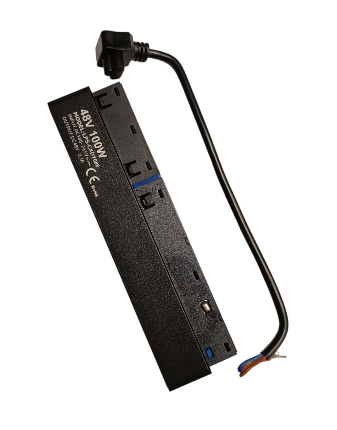 Блок питания 100Вт/48V для магнитного шинопровода — это низковольтный понижающий трансформатор, который преобразует 220V (сеть) в безопасное для магнитной системы напряжение 48V, позволяя подключать светильники и перемещать их по треку, обеспечивая питание до 100 Вт.