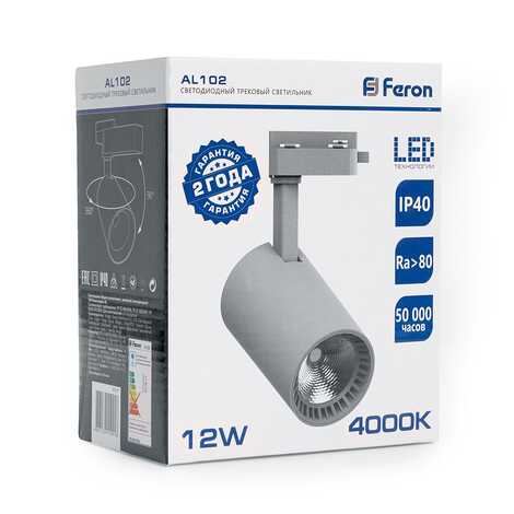 Светильник трековый на шинопровод, однофазный (ДПО) FERON AL102, 12W, 4000К (белый), 170-265V, 1080Lm, угол освещения 60°, цвет белый, корпус алюминий, рассеиватель поликарбонат, вращение →360°/↓90°, 80*129*182 мм