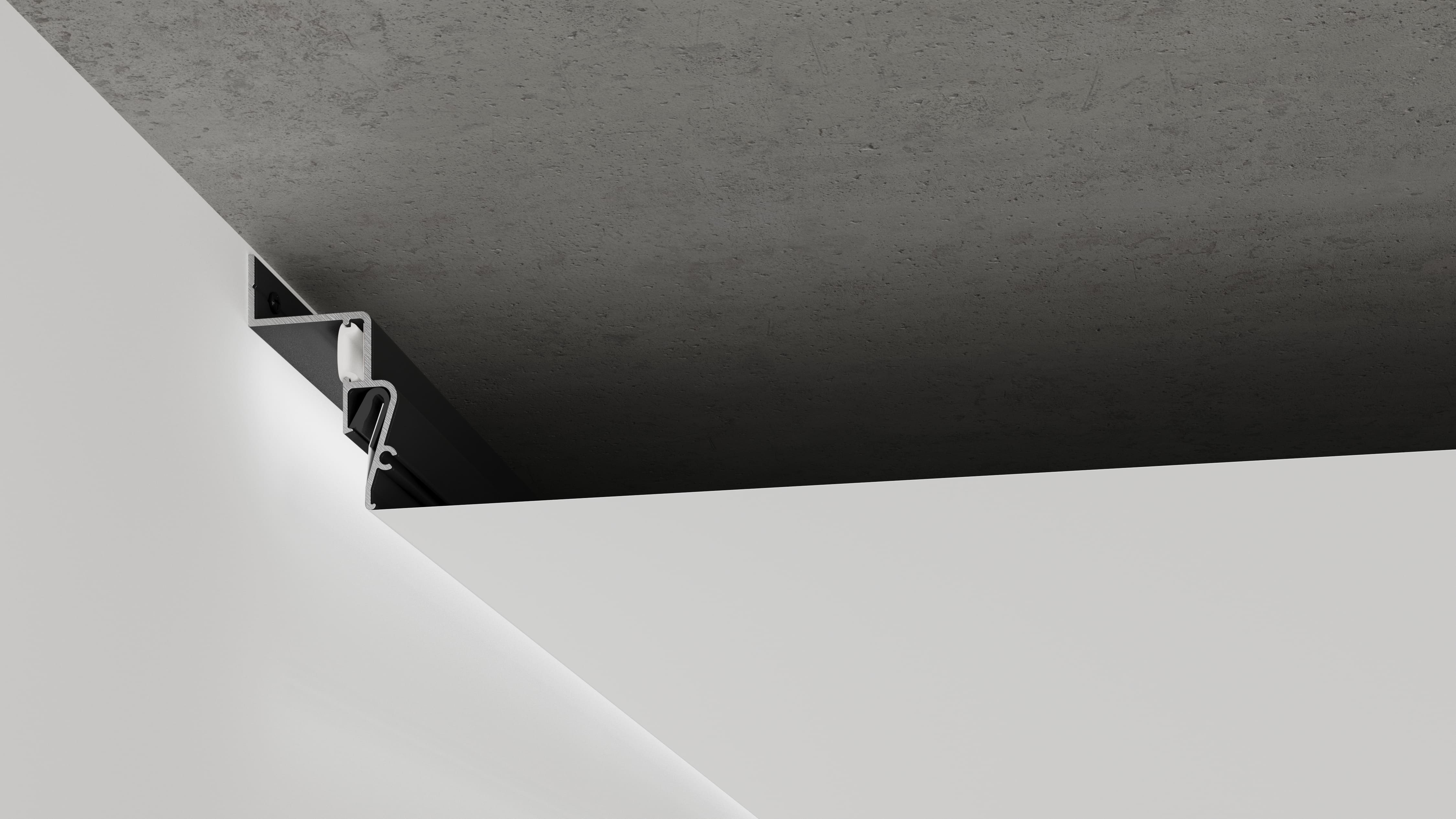 Стеновой профиль Контур-Про для парящей подсветки вдоль стен c использованием светодиодной ленты и светорассеивающей вставки.