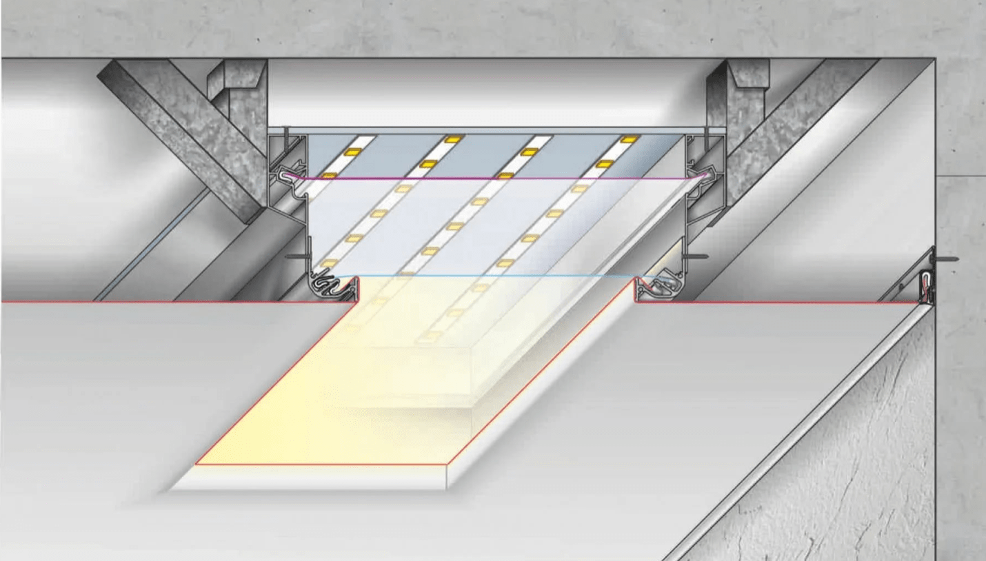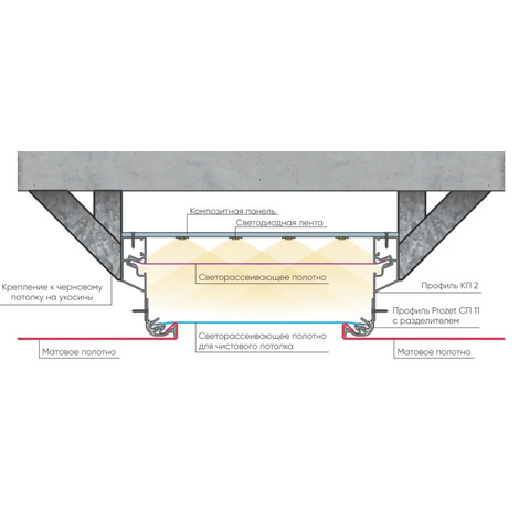 Профиль СП11 в сочетании с профилем КП2 от Prozet позволяет создавать эффектные и функциональные световые элементы интерьера.