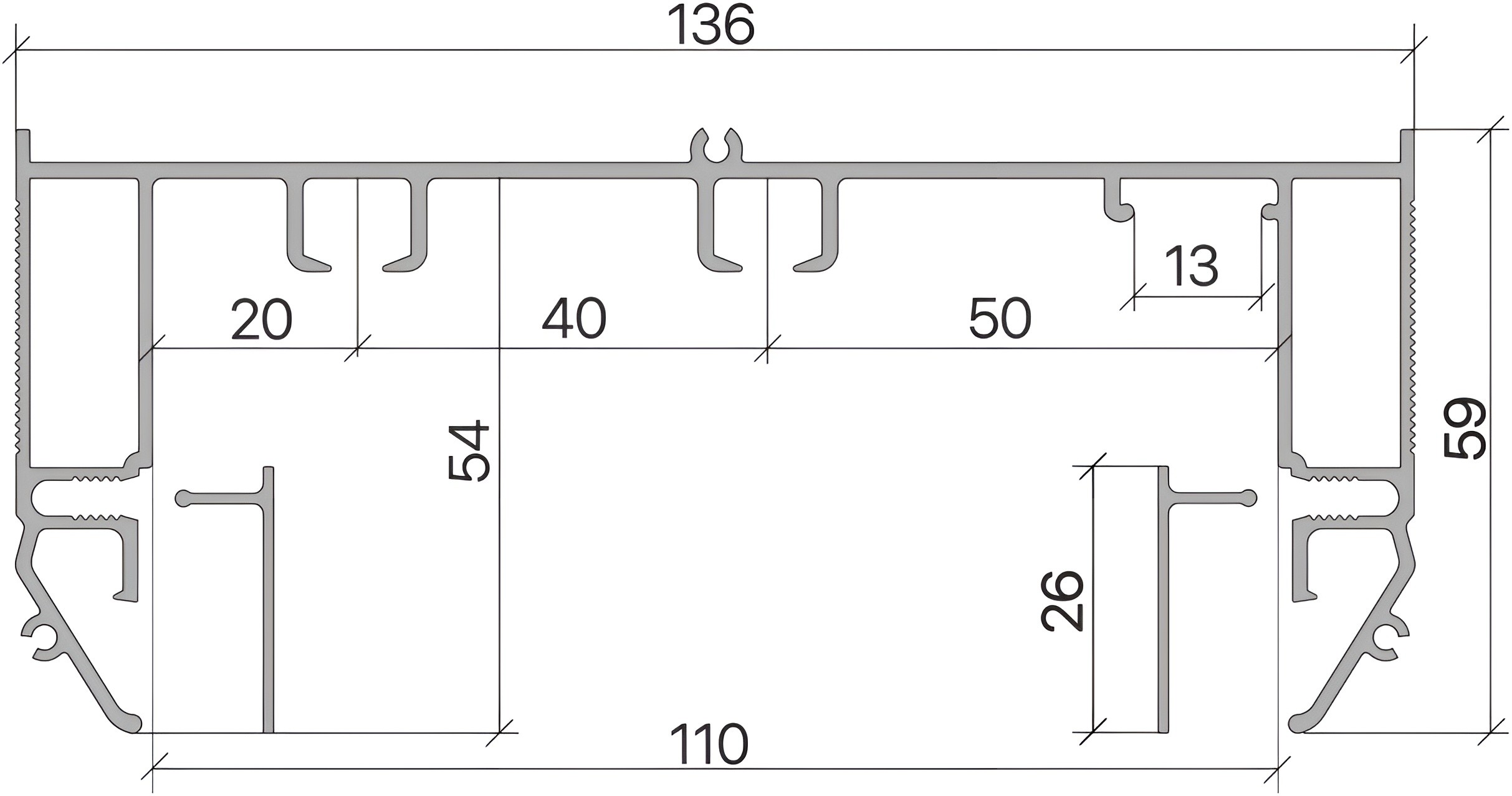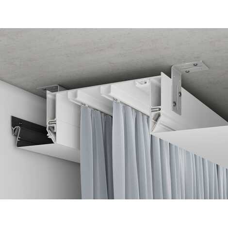 - расстояние от первой линии крючков до внутреннего края профиля составляет 5 см, а между первым и вторым рядом штор - 4 см, что обеспечивает красивый вид шторы в сложенном состоянии, так как она не пережимается и не деформируется, а глубина карниза 54 мм создает эффект "парящих" штор и скрывает крючки;