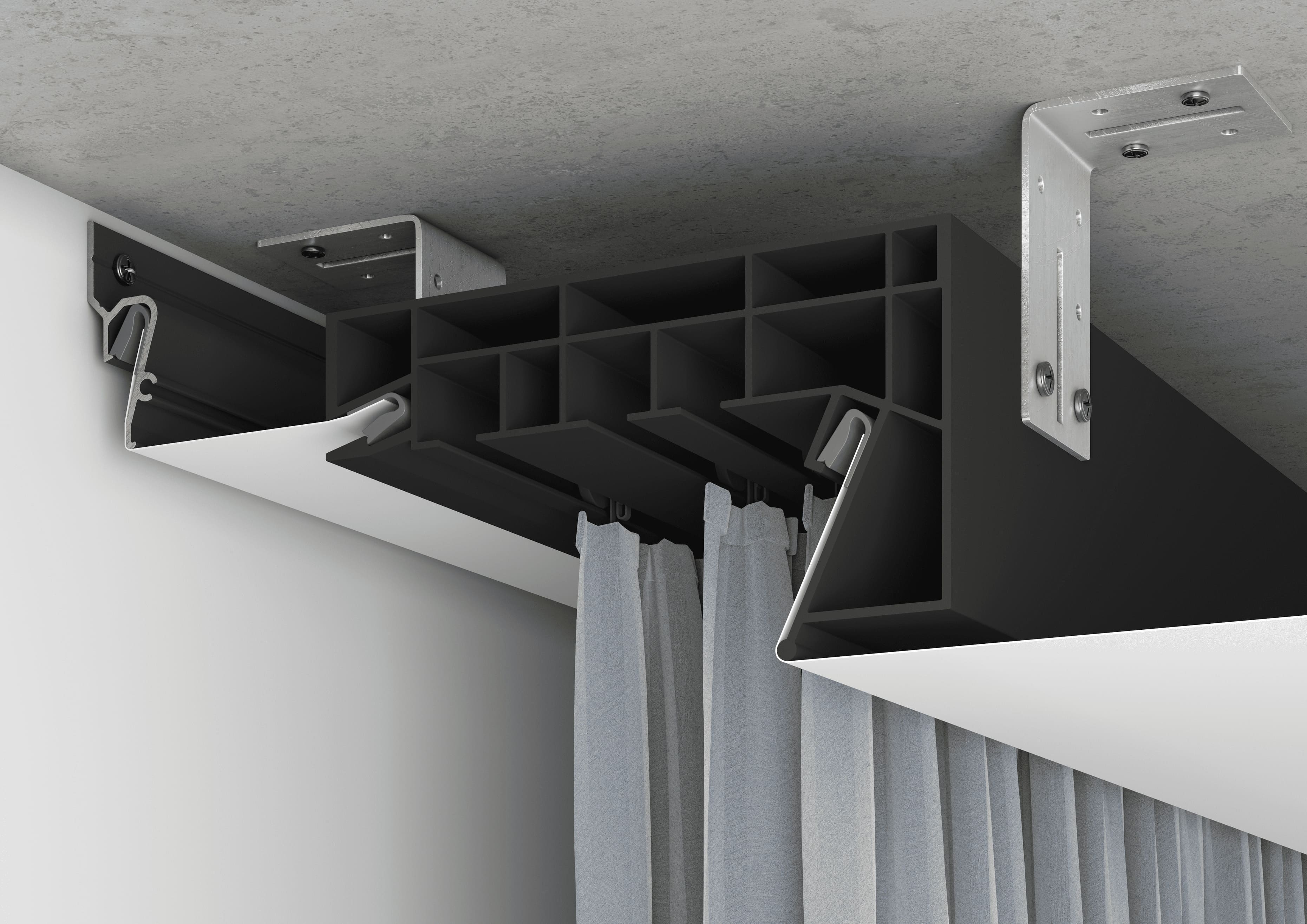 Профиль ПК-5 карнизный ПВХ совмещает в себе гардину и конструкцию под переход уровня в едином изделии, в результате чего формируется скрытая ниша под штору с интегрированным ПВХ карнизом.