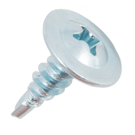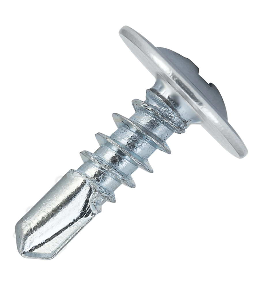 Саморез с прессшайбой и сверловидным наконечником, шляпка самореза выполнена в виде полукруглой головки на которую напрессована плоская шайба.