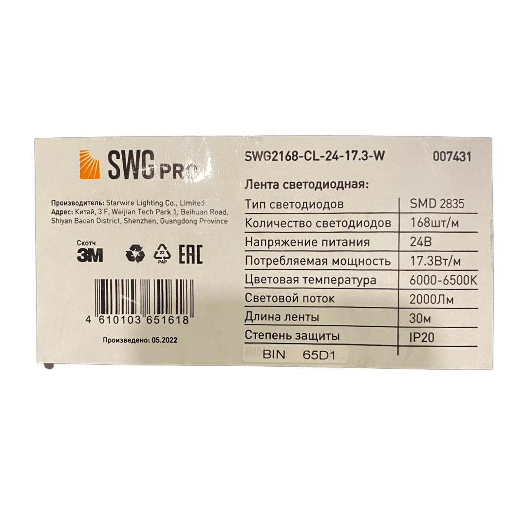 Светодиодная лента SWG PRO 17,3w/168 точек/6000-6500К (24v)